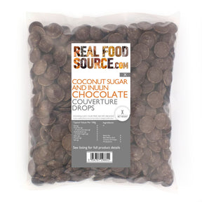 Our 60% dark chocolate drops, sweetened with coconut sugar and inulin, are available in small coin-sized drops. The only ingredients used are coconut sugar, cocoa liquor, cocoa butter, inulin, and nothing else. This chocolate is free of eggs, gluten, dairy, and vegetable oils, making it suitable for vegans. Coconut sugar, with a lower GI rating than cane sugar and added nutrients, gives a subtle caramel taste to the chocolate. It is a perfect option for those following primal diets. This chocolate, made with coconut sugar and inulin, may be suitable for various intolerances and conditions. We highly recommend doing your own independent research at the RealFoodSource.
