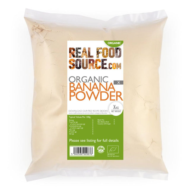 Our excellent organic dried banana powder. Vine-ripened bananas are dried to create a delicious versatile powder. Nothing is added just 100% Organic Banana.