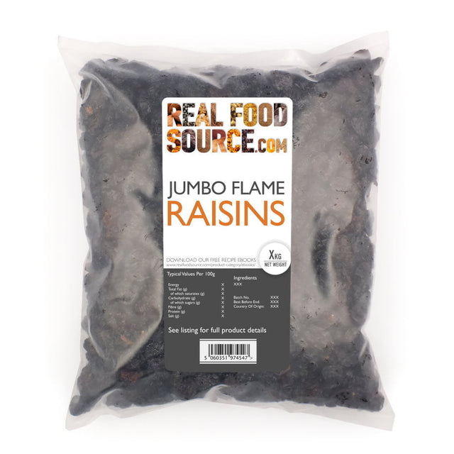 Experience the delight of our Jumbo Flame Raisins - plump, sweet, and chewy dried grapes. Loaded with fibre, antioxidants, and essential nutrients like potassium, calcium, and B vitamins, these raisins also have a touch of sunflower oil (0.5%) to prevent clumping. Discover the perfect balance of flavour and nutrition in every bite.