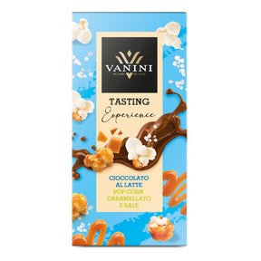 The Vanini Tasting Experience milk chocolate bar, enriched with caramelised popcorn and a touch of salt, delights the palate with a perfect balance between sweetness and savouriness: a unique combination of flavours.